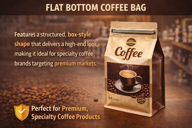 Flat bottom coffee bags, also known as box pouches, feature a structured design with a flat base and multiple panels that allow the bag to stand upright on shelves.