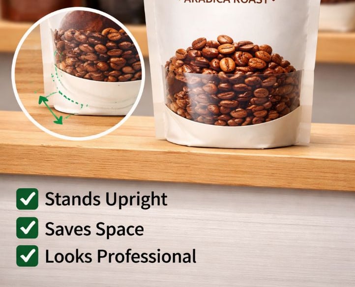 Stand up coffee bags, also known as doy packs, are flexible packaging solutions designed with a bottom gusset that allows the bag to stand upright on shelves. They are widely used for retail coffee packaging due to their excellent display performance and strong barrier protection.
